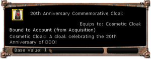 Cosmetic Cloak | 1 | Bound to Account on Acquire | Anniversary Party, Turn in speak to Weaver in The Anniversary Celebration, or Weaver-in-Training in the Hall of Heroes after claiming one from Weaver | |