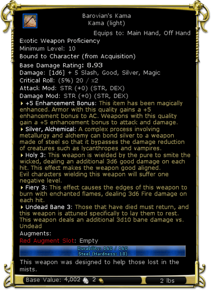 | Damage and Type | [1d6] + 5 Slash, Good, Silver, Magic | |