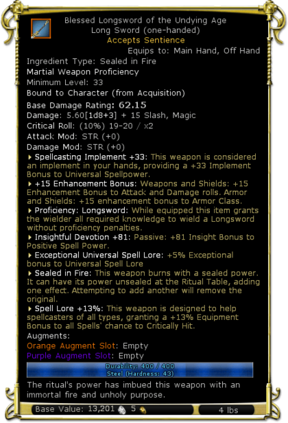 | Description | The ritual's power has imbued this weapon with an immortal fire and holy purpose. | |