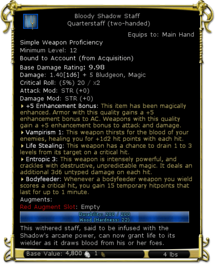 | Description | This withered staff, said to be infused with the Shadow's arcane power, can now grant life to its wielder as it draws blood from his or her foes. | |