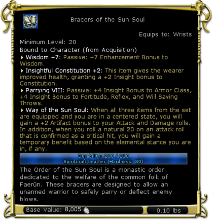| Description | The Order of the Sun Soul is a monastic order dedicated to the welfare of the common folk of Faerûn. These bracers are designed to allow an unarmed warrior to safely parry or deflect enemy blows. | |