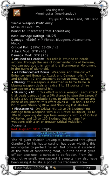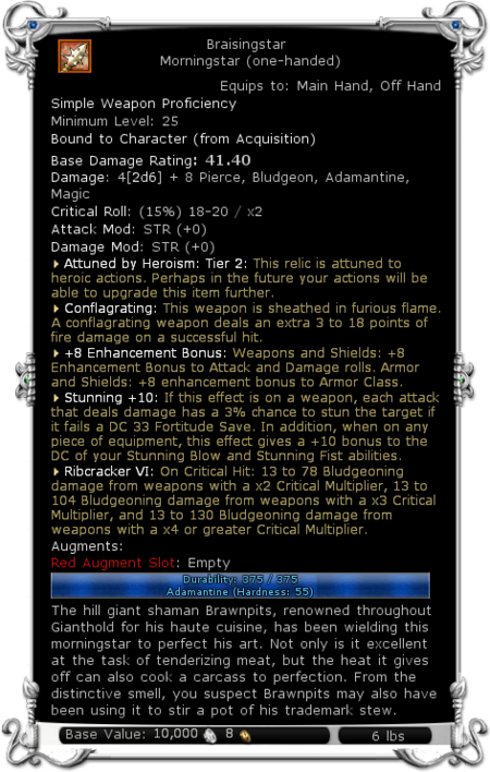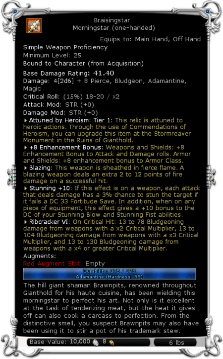 | Description | The hill giant shaman Brawnpits, renowned throughout Gianthold for his haute cuisine, has been wielding this morningstar to perfect his art. Not only is it excellent at the task of tenderizing meat, but the heat it gives off can also cook a carcass to perfection. From the distinctive smell, you suspect Brawnpits may also have been using it to stir a pot of his trademark stew. | |