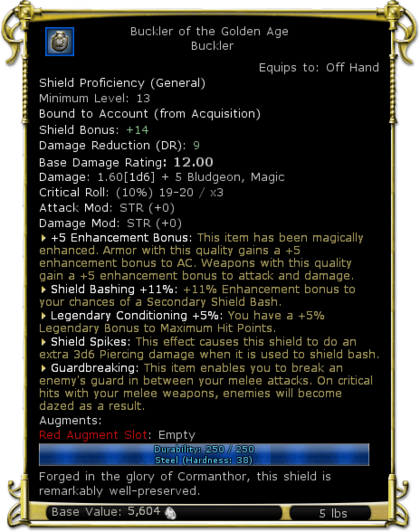 | Description | Forged in the Glory of Cormanthor, this shield is remarkably well-preserved. | |