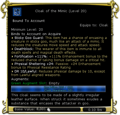 | Description | This cloak seems to be made of a slightly irregular leather surface. When struck it sometimes exudes a substance that encases the attacker in goo. | |