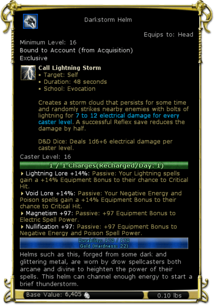 | Description | Helms such as this, forged from some dark and glittering metal, are worn by drow spellcasters both arcane and divine to heighten the power of their spells. This helm can channel enough energy to start a brief thunderstorm. | |
