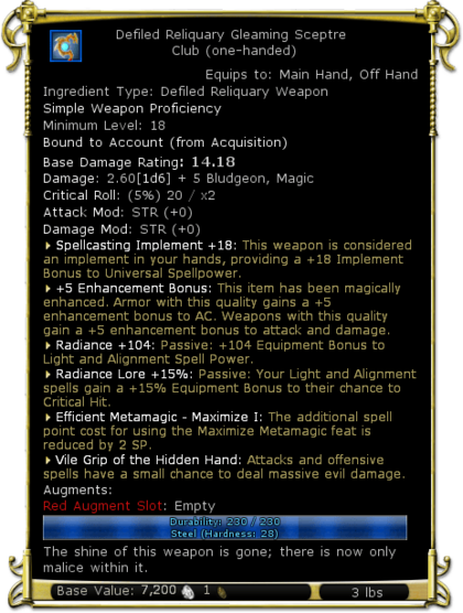 | Location | Unholy Defiler of the Hidden Hand, defiled version of Shining Reliquary Gleaming Sceptre | |