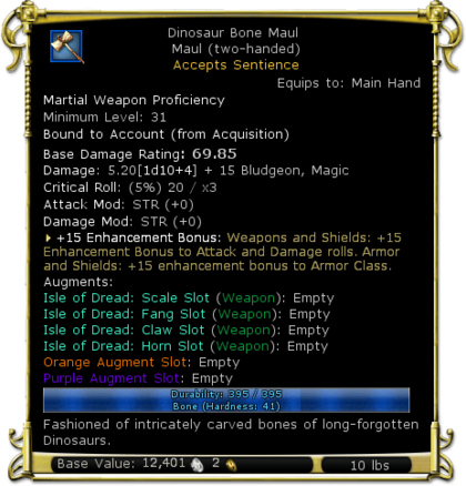 | Damage and Type | 5.20[1d10+4] + 15 Bludgeon, Magic | |