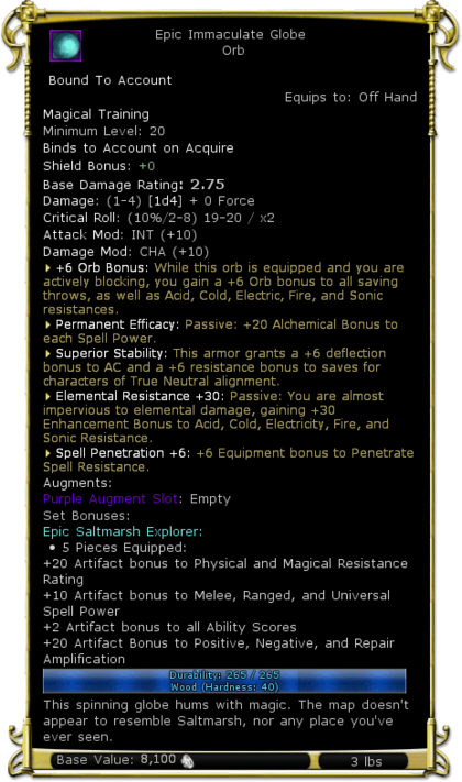| Description | This spinning globe hums with magic. The map doesn't appear to resemble Saltmarsh, nor any place you've ever seen. | |