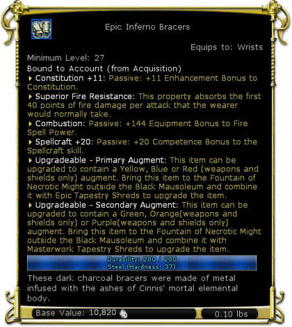 | Description | These dark charcoal bracers were made of metal infused with the ashes of Cinnis' mortal elemental body. | |