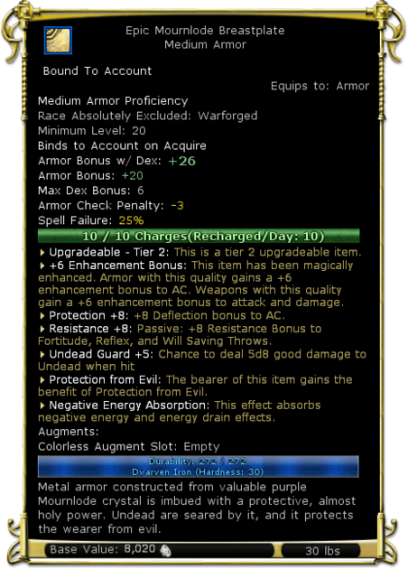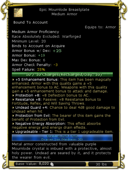| Description | Metal Armor constructed from valuable purple Mournlode crystal is imbued with a protective, almost holy power. Undead are seared by it, and it protects the wearer from evil. | |