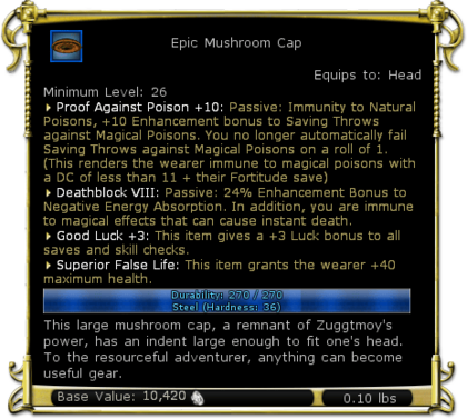 | Description | This large mushroom cap, a remnant of Zuggtmoy's power, has an indent large enough to fit one's head. To the resourceful adventurer, anything can become useful gear. | |