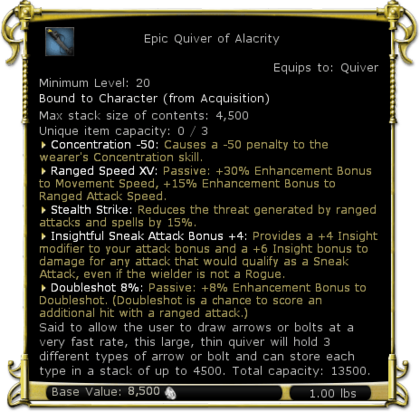 | Description | Said to allow the user to draw arrows or bolts at a very fast rate, this large, thin quiver will hold 3 different types of arrow or bolt and can store each type in a stack of up to 4500. Total capacity: 13500. | |