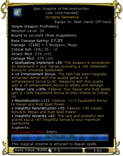 | Description | This magical sceptre is attuned to Repair spells. | |