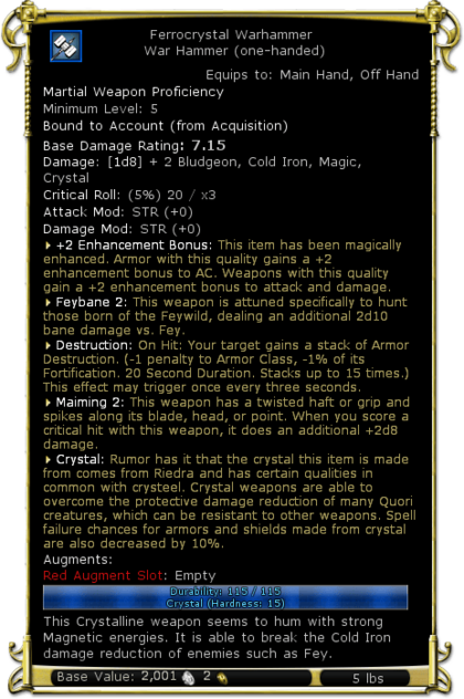 | Description | This Crystalline weapon seems to hum with strong Magnetic energies. It is able to break the Cold Iron damage reduction of enemies such as Fey. | |