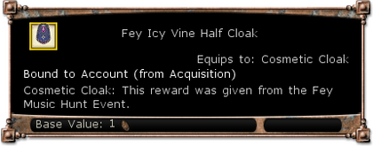 | Description | Cosmetic Cloak: This reward was given from the Fey Music Hunt Event | |