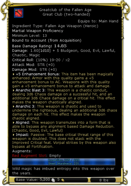 | Damage and Type | 1.60[1d10] + 5 Bludgeon, Good, Evil, Lawful, Chaotic, Magic | |