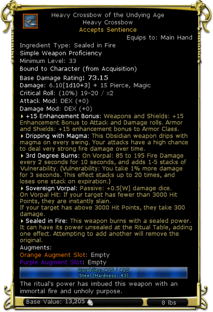 | Description | The ritual's power has imbued this weapon with an immortal fire and unholy purpose. | |