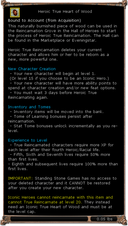 Heroic True Heart of Wood (formerly known as True Druidic Heart of Wood) is used for True Reincarnation: to reset your character's abilities, skills, change their appearance and race or class while also gaining past life bonuses, feats and more ability points.