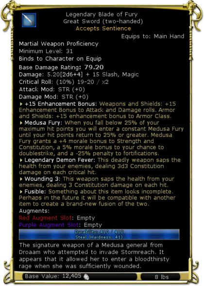 | Description | The signature weapon of a Medusa general from Droaam who attempted to invade Stormreach. It appears that it allowed her to enter a bloodthirsty rage when she was sufficiently wounded. | |