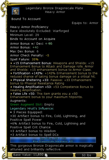 | Description | This gorgeous Bronze Dragonscale armor is magically attuned and brilliantly reflective. | |
