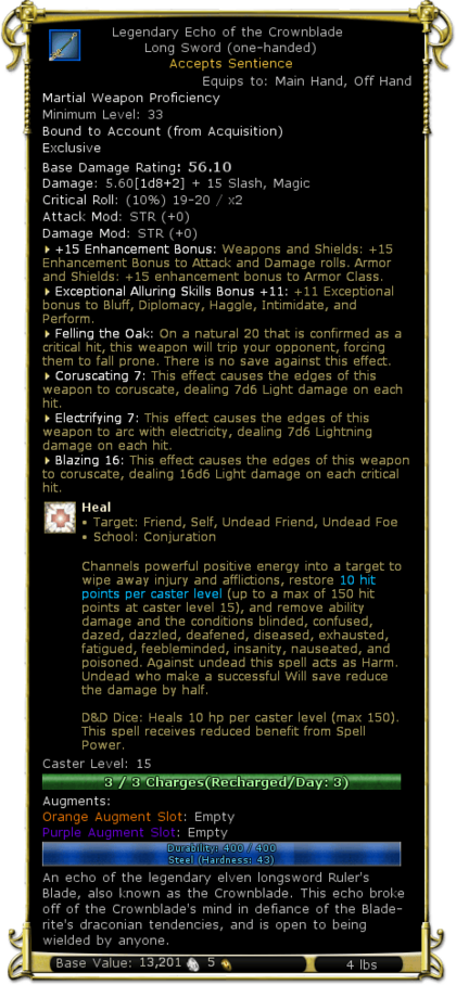 | Description | An echo of the legendary elven longsword Ruler's Blade, also known as the Crownblade. This echo broke off of the Crownblade's mind in defiance of the Blade-rite's draconian tendencies, and is open to being wielded by anyone. | |