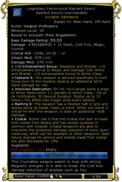 | Description | This Crystalline weapon seems to hum with strong Magnetic energies. It is able to break the Cold Iron damage reduction of enemies such as Fey. | |