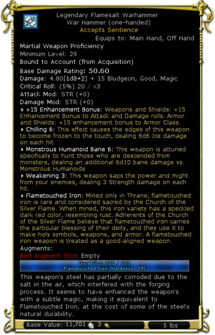 | Damage and Type | 4.80[1d8+2] + 15 Bludgeon, Good, Magic | |