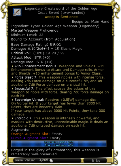 | Description | Forged in the glory of Cormanthor, this weapon is remarkably well-preserved. | |