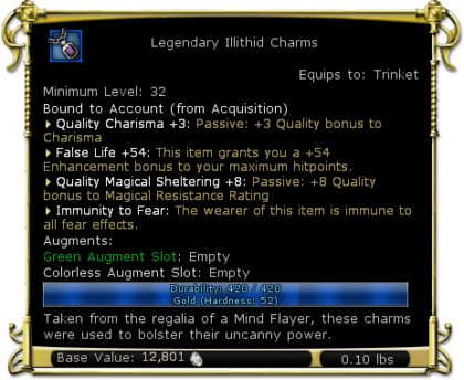 | Description | Taken from the regalia of a Mind Flayer, these charms were used to bolster their uncanny power. | |