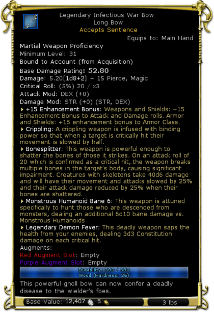 | Description | This powerful gnoll bow can now confer a deadly disease to the wielder's foes. | |
