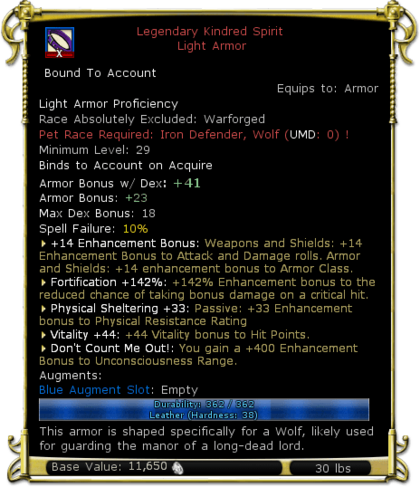 This item can only be equipped by Pets. As it does not specifically exclude Iron Defenders like most armor, it can be equipped by both Wolves and Iron Defenders, even though Iron Defenders can usually only equip Docents. | |