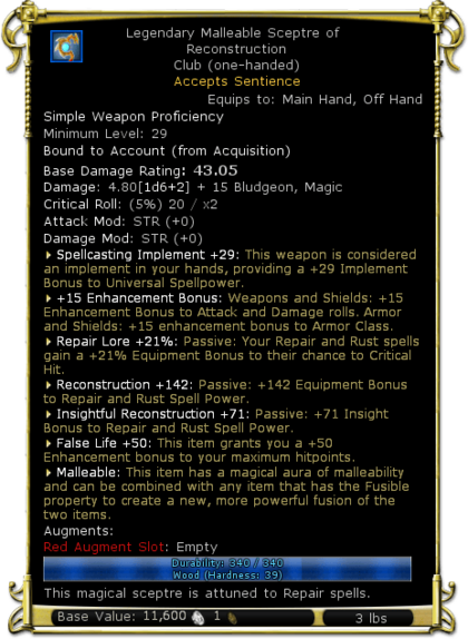 | Description | This magical sceptre is attuned to Repair spells. | |