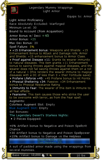 | Description | A suit of padded armor made using the wrappings from several mummies. | |