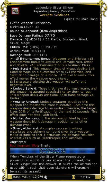 | Description | When Templars of the Silver Flame requested a powerful crossbow for use against the undead, the Silver Slinger was the answer. It blunts the ammunition used with it such that even skeletons will crumble beneath its assault. | |