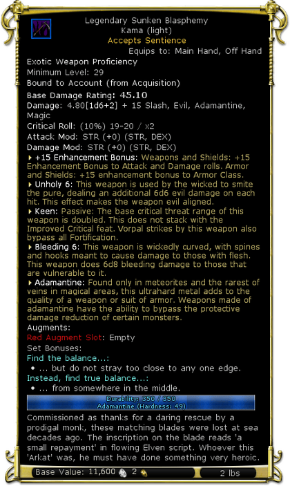 A set of these will grant Inevitable Balance - 10% Melee Power , 10% Doublestrike, and extra bane damage on sneak attack. There are various types of these kamas, such as obscurity, radiance, virtue, etc. So far observed that different variations will grant the same set bonus, although it was also observed that two of the same variations will also show an icon called "Too close to the edge" and gives the description "You are to close the edge of alignment, these weapons work best when they are different from one another." |
