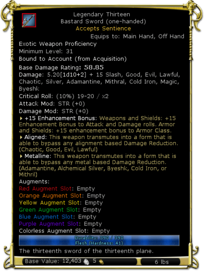 | Damage and Type | 5.20[1d10+2] + 15 Slash, Good, Evil, Lawful, Chaotic, Silver, Adamantine, Mithral, Cold Iron, Magic, Byeshk | |