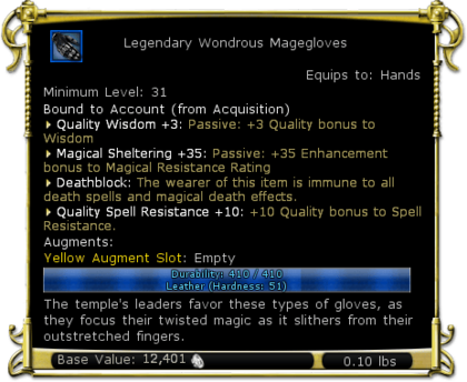 | Description | The temple's leaders favor these types of gloves, as they focus their twisted magic as it slithers from their outstretched fingers. | |