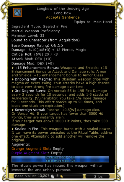 | Description | The ritual's power has imbued this weapon with an immortal fire and unholy purpose. | |