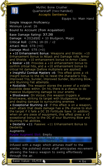 | Description | Infused with a magic which attunes itself to the wielder, the polished stone staff anticipates movement allowing the heavy weapon to swing effortlessly through the air. | |