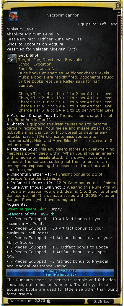 This Runearm seems to generate terrible and forbidden knowledge at a moment's notice. Thankfully, these accursed books are used for little else other than blunt force trauma. | |||||||||||||||||||||
