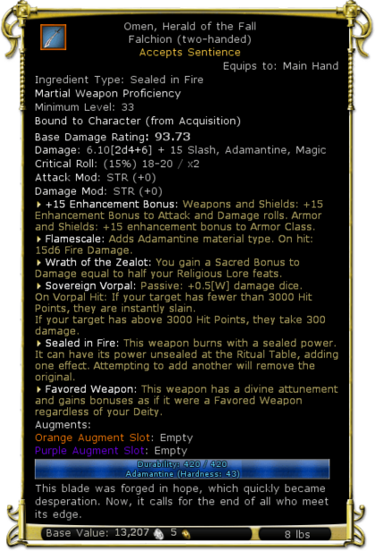 | Damage and Type | 6.10[2d4+6] + 15 Slash, Adamantine, Magic | |