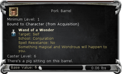 Bound to Character on Acquire: This item is Bound to Character on Acquire - Effect: Wand of Wonder: Something magical and Woundrous will happen to you. When detonated, a fearsome explosion (which can damage players) spews forth up to 50 Tasty Hams for your enjoyment. (CL: 6)