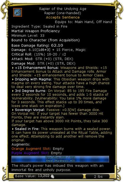 | Description | The ritual's power has imbued this weapon with an immortal fire and unholy purpose. | |