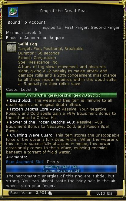| Description | The necromantic energies of this ring are subtle, but strong. You can almost taste the briny salt in the air when its on your finger. | |