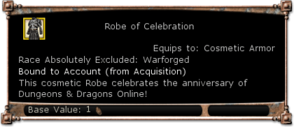 | Description | This cosmetic Robe celebrates the anniversary of Dungeons & Dragons Online! | |