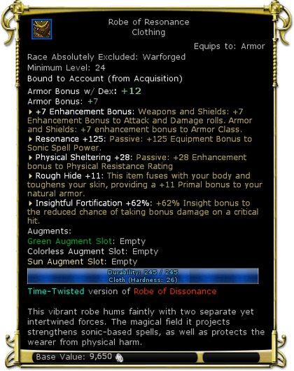 This vibrant robe hums faintly with two separate yet intertwined forces. The magical field it projects strengthens sonic-based spells, as well as protects the wearer from physical harm. | |