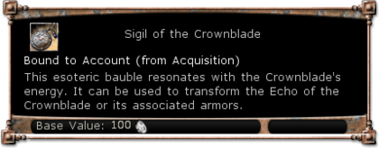 This esoteric bauble resonates with the Crownblade's energy. It can be used to transform the Echo of the Crownblade or its associated armors.