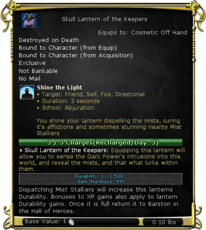 | Description | Dispatch these pockets of mist will increase this lanterns Durability. Bonuses to XP gains also apply to lantern Durability gains. Once it is full return it to Barston in the Hall of Heroes. | |