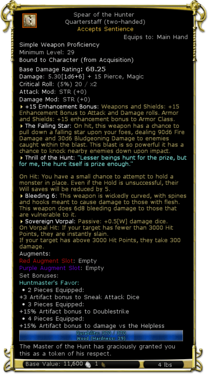 | Damage and Type | 5.30[1d6+6] + 15 Pierce, Magic | |