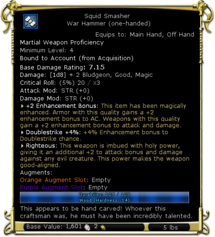 | Damage and Type | [1d8] + 2 Bludgeon, Good, Magic | |